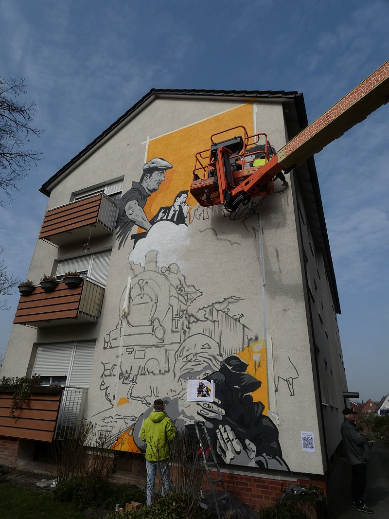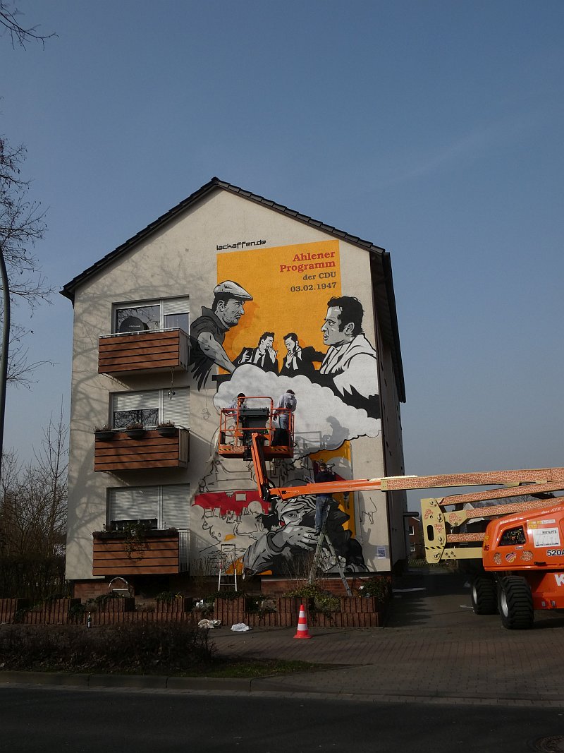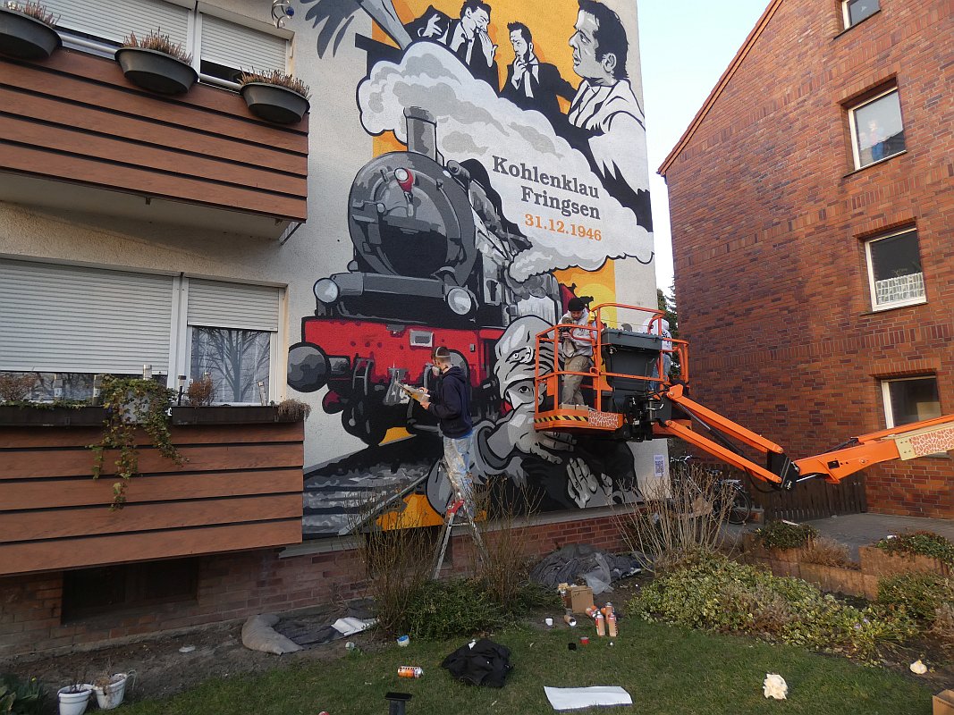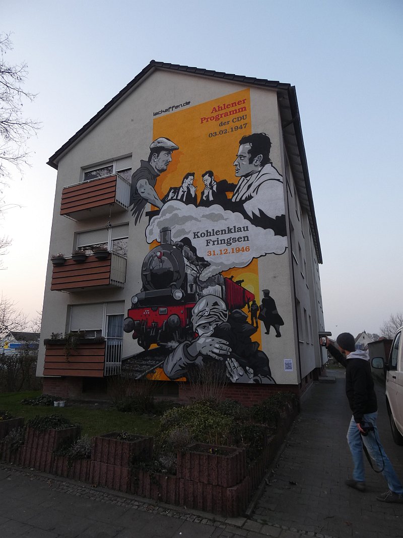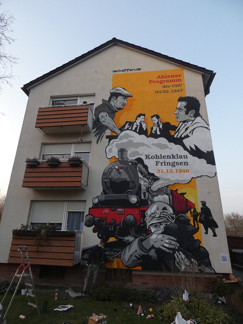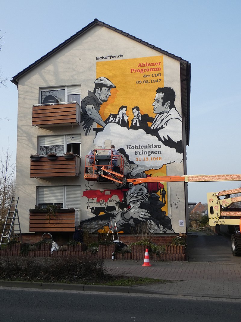 Im Februar 2020 war ich bei meinem Freund Thomas Schwarz in München. Wir kennen uns seit der Gynnasialzeit in Ahlen, wo wir 1964-1972 in derselben Klasse waren. Während des Aufenthaltes hatte Thomas eines Abends Besuch von einem Nachbarn und Künstler, der schon zahlreiche Fassaden bemalt hatte. Einige Gläser Wein und die anregende Bilderschau seiner Werke ließen mich zu der Bemerkung hinreißen, ich könne auch eine große freie Hauswandfläche ohne Bemalung zur Verfügung stellen. Der Künstler war gleich begeistert. In der Nacht haben wir dann noch gesponnen, was man darauf wie darstellen könnte. Aber ich habe gleich eingeworfen, dass es an der Stelle die Themen "Fringsen" und das "Ahlener Programm" sein müssten, zumal beide Ereignisse im kommenden Winter 75-jähriges Jubiläum haben und speziell "Fringsen" in Form von Kohlenklau und der Ort zusammen passen. Dann kam das Problem. Dieser Mensch ist "ein richtiger Künstlertyp". Obwohl ich 2020 noch zweimal in München war, bewegte sich das Projekt trotz Einsatz modernster Kommunikationsmittel nicht von der Stelle. Inzwischen hatte mich die Idee aber gepackt. Auch der Hausverwalter Carsten Vienken hatte sich schon engagiert und bei der Stadt Erkundigungen eingezogen, ob, und welche Form von Auflagen es für solche Graffiti gibt. Die Stadtverwaltung wollte anhand des Entwurfs entscheiden. Aber diesen Entwurf gab es ja noch nicht, sondern nur die Idee und dass diese unbedingt im Jubiläumsjahr 2021 realisiert werden müsse.