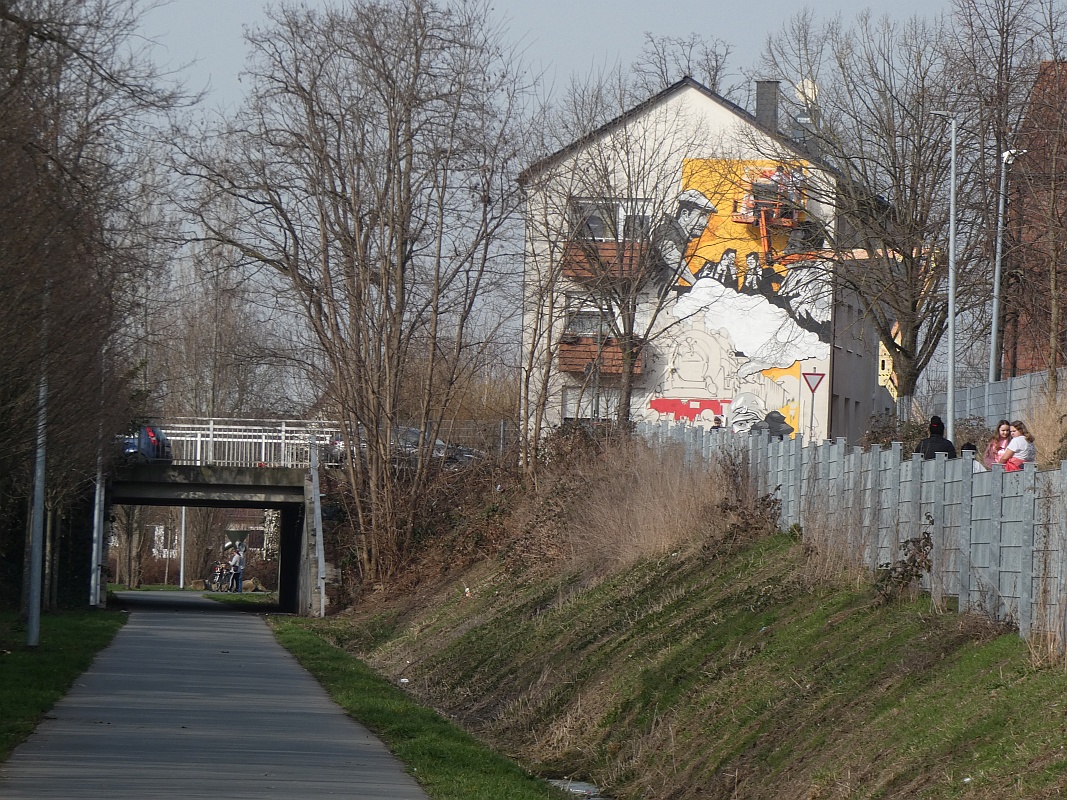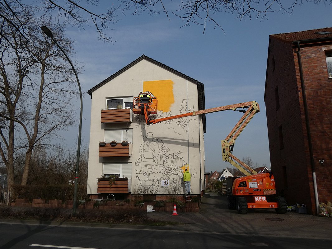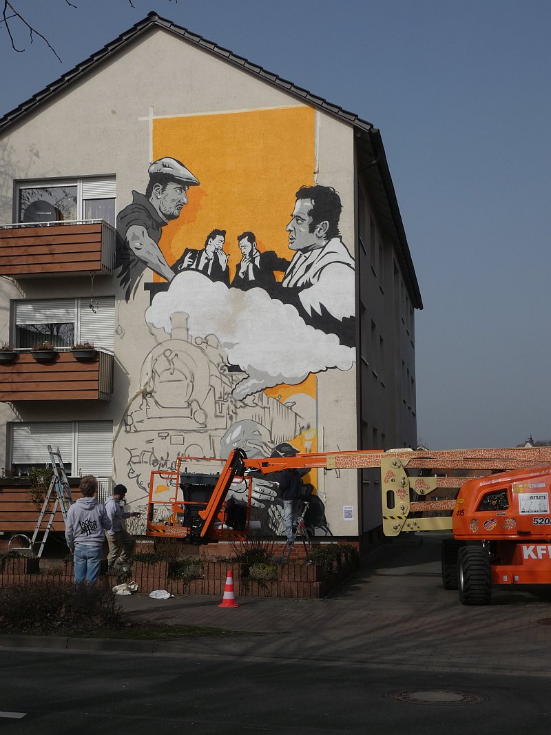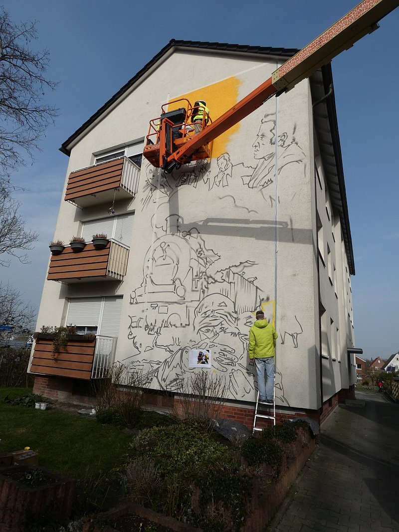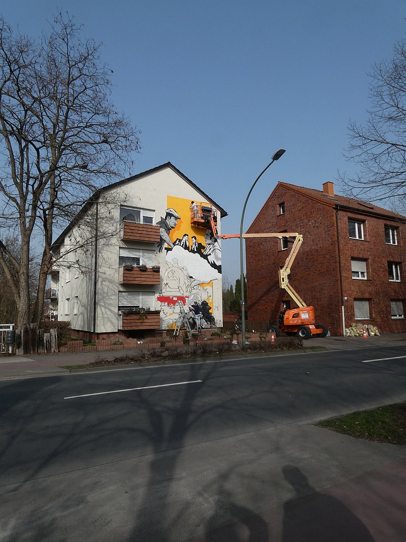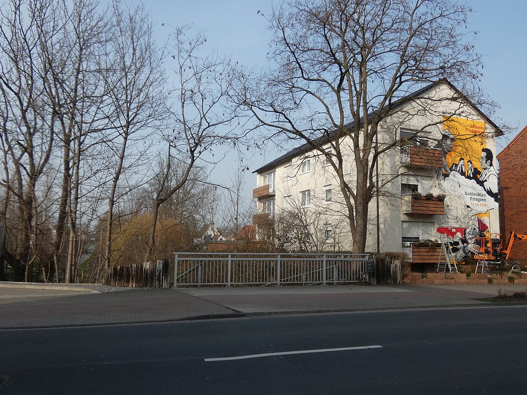 Im Februar 2020 war ich bei meinem Freund Thomas Schwarz in München. Wir kennen uns seit der Gynnasialzeit in Ahlen, wo wir 1964-1972 in derselben Klasse waren. Während des Aufenthaltes hatte Thomas eines Abends Besuch von einem Nachbarn und Künstler, der schon zahlreiche Fassaden bemalt hatte. Einige Gläser Wein und die anregende Bilderschau seiner Werke ließen mich zu der Bemerkung hinreißen, ich könne auch eine große freie Hauswandfläche ohne Bemalung zur Verfügung stellen. Der Künstler war gleich begeistert. In der Nacht haben wir dann noch gesponnen, was man darauf wie darstellen könnte. Aber ich habe gleich eingeworfen, dass es an der Stelle die Themen "Fringsen" und das "Ahlener Programm" sein müssten, zumal beide Ereignisse im kommenden Winter 75-jähriges Jubiläum haben und speziell "Fringsen" in Form von Kohlenklau und der Ort zusammen passen. Dann kam das Problem. Dieser Mensch ist "ein richtiger Künstlertyp". Obwohl ich 2020 noch zweimal in München war, bewegte sich das Projekt trotz Einsatz modernster Kommunikationsmittel nicht von der Stelle. Inzwischen hatte mich die Idee aber gepackt. Auch der Hausverwalter Carsten Vienken hatte sich schon engagiert und bei der Stadt Erkundigungen eingezogen, ob, und welche Form von Auflagen es für solche Graffiti gibt. Die Stadtverwaltung wollte anhand des Entwurfs entscheiden. Aber diesen Entwurf gab es ja noch nicht, sondern nur die Idee und dass diese unbedingt im Jubiläumsjahr 2021 realisiert werden müsse.