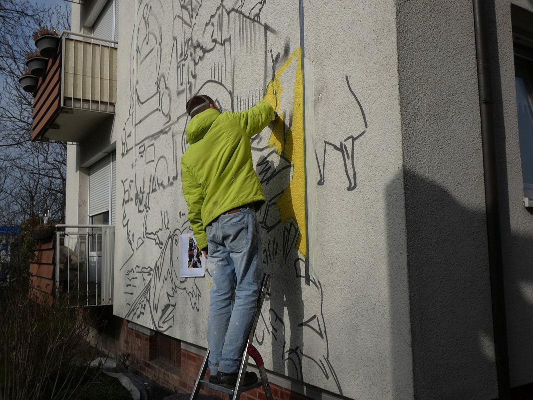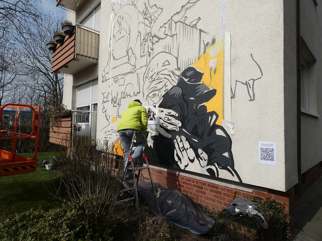 Der Entwurf des Graffitos wurde am Abend des 2. März 2021 nach Sonnenuntergang mit einem Overheadprojektor auf die Wand projiziert